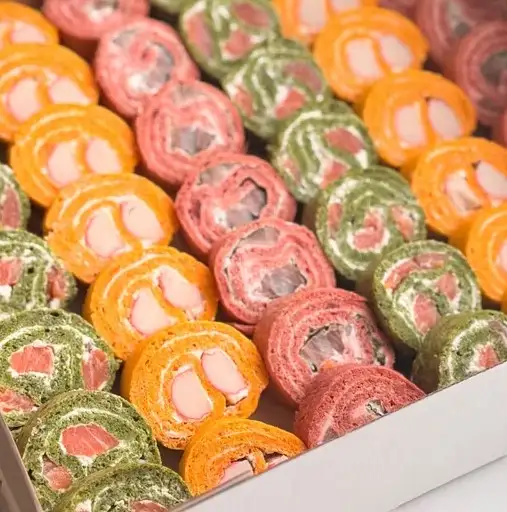 Морковь, шпинат, свекла, яйца, соль, мука, крабовые палочки, форель слабосоленая, сельдь, сыр творожный,листья салата.