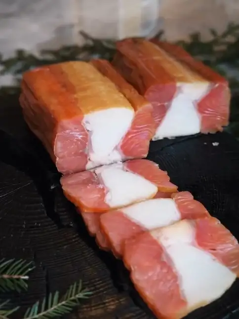 Наш рулет холодного копчения — сочный, слабой соли, легко нарезается, ярко и празднично выглядит! Рыбка склеивается желатином, а не химией В составе: • дикая кета • масляная рыба • жирненькая форель Этот рулет уже заслужил множество вкусных отзывов от наших гостей, и будет прекрасным наполнением вашего праздничного стола.