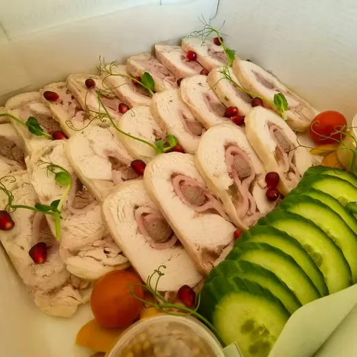Вес 1 кг Филе тушки курицы отбито и завернуто в виде рулета, с начинкой внутри