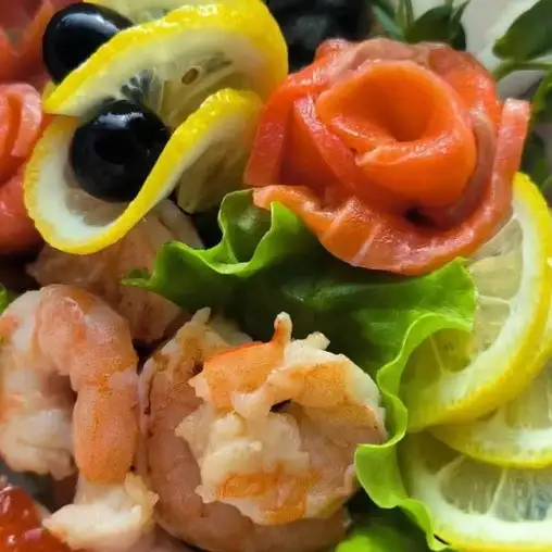 Форель, семга, тунец, палтус, макрель Скумбрия,креветки, икра Тарталетки Салат, лимон,маслины, микрозелень