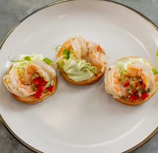 Багет, креветки, овощная сальса, крем чиз с базиликом и песто