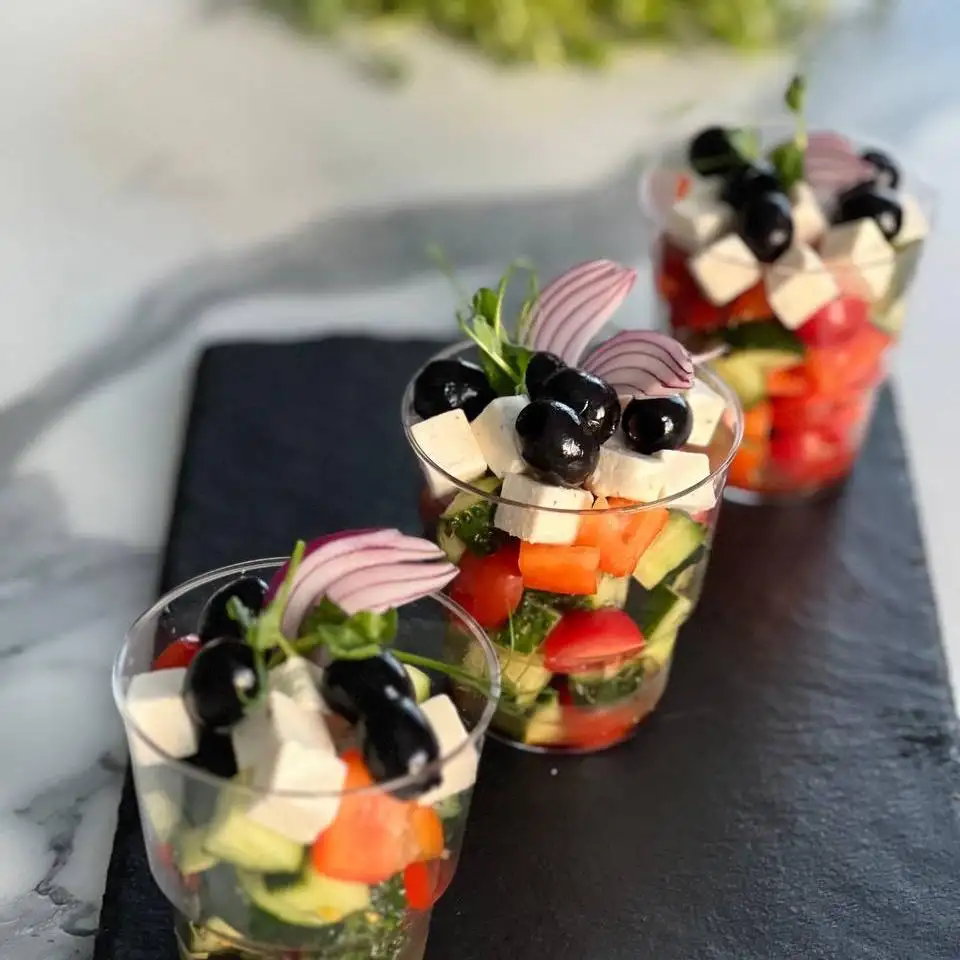 Черри, огурец свежий, перец болгарский, маслины, сыр Фета, микро зелень, заправка. Заказ от 4 стаканчиков Вес 130 гр