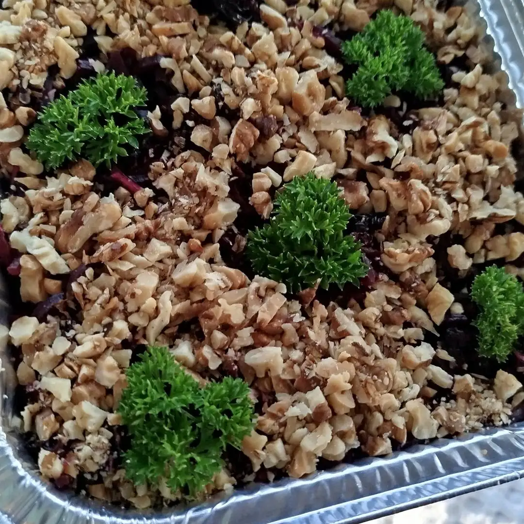 Состав: свекла, чернослив, орех грецкий, чеснок. Салат без заправки, при необходимости можно обсудить варианты заправки.