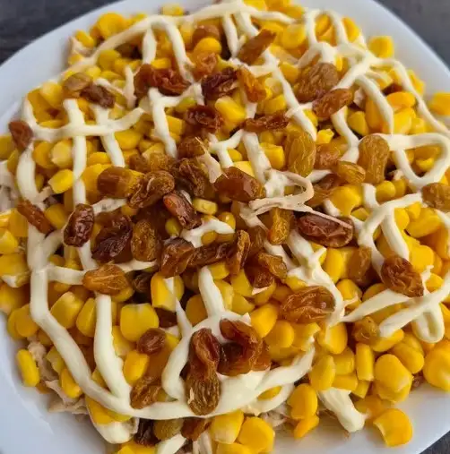 В составе: куриное бедро, лук, морковь, кукуруза, изюм, орех грецкий