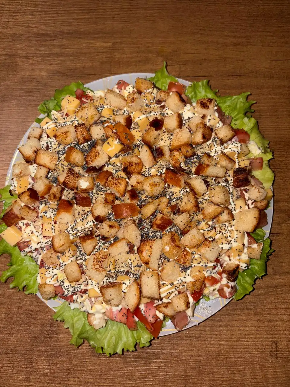 Листья салата, копченая курица, яйца, томаты, сыр, сухарики, майонез