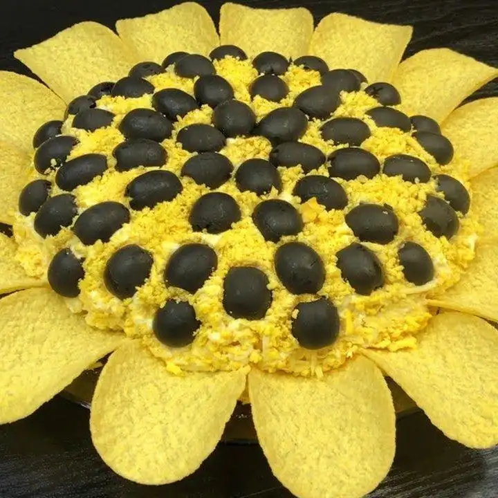 — копченая курица — шампиньоны — лук (обжаренный) — белок яйца — сыр — желток яйца — маслины — чипсы