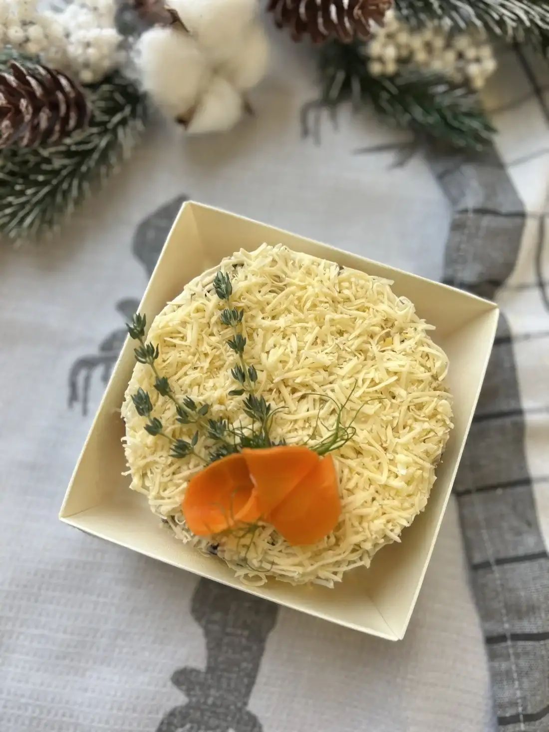 Рыба отварная, морковь и лук пассерованные, шампиньоны обжаренные, твердый сыр, масло растительное, майонез.