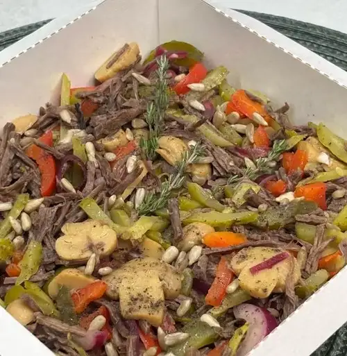 Говядина, перец свежий, грибы маринованные, огурец маринованный, заливка.