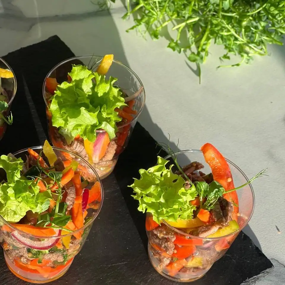 Говядина гриль, перец болгарский, огурец свежий, морковь свежая, лук красный репчатый, заправка. Заказ от 4 стаканчиков Вес 130 гр