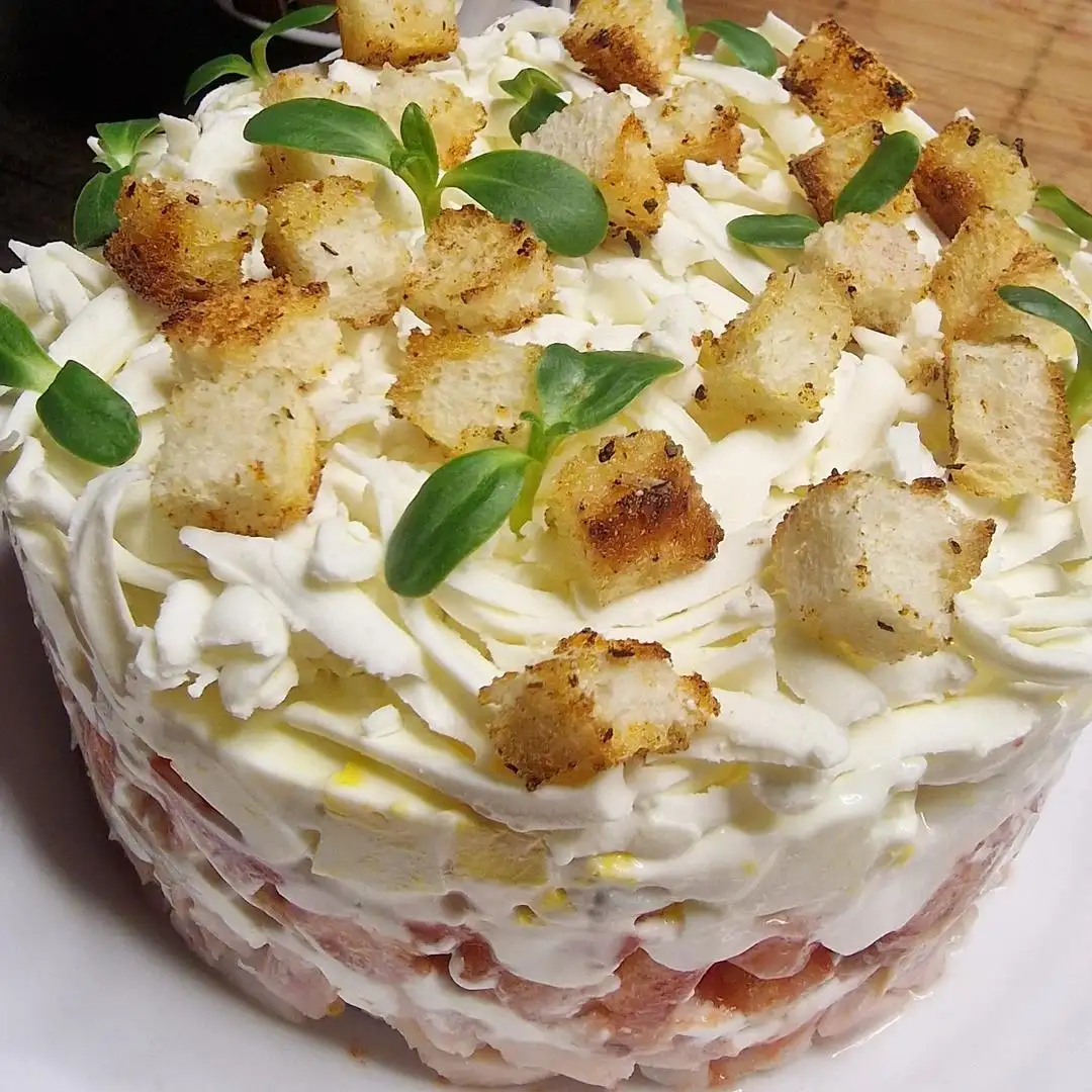 Состав: копчёная курица, яйцо, томаты, творожный сыр, майонез, сухарики.