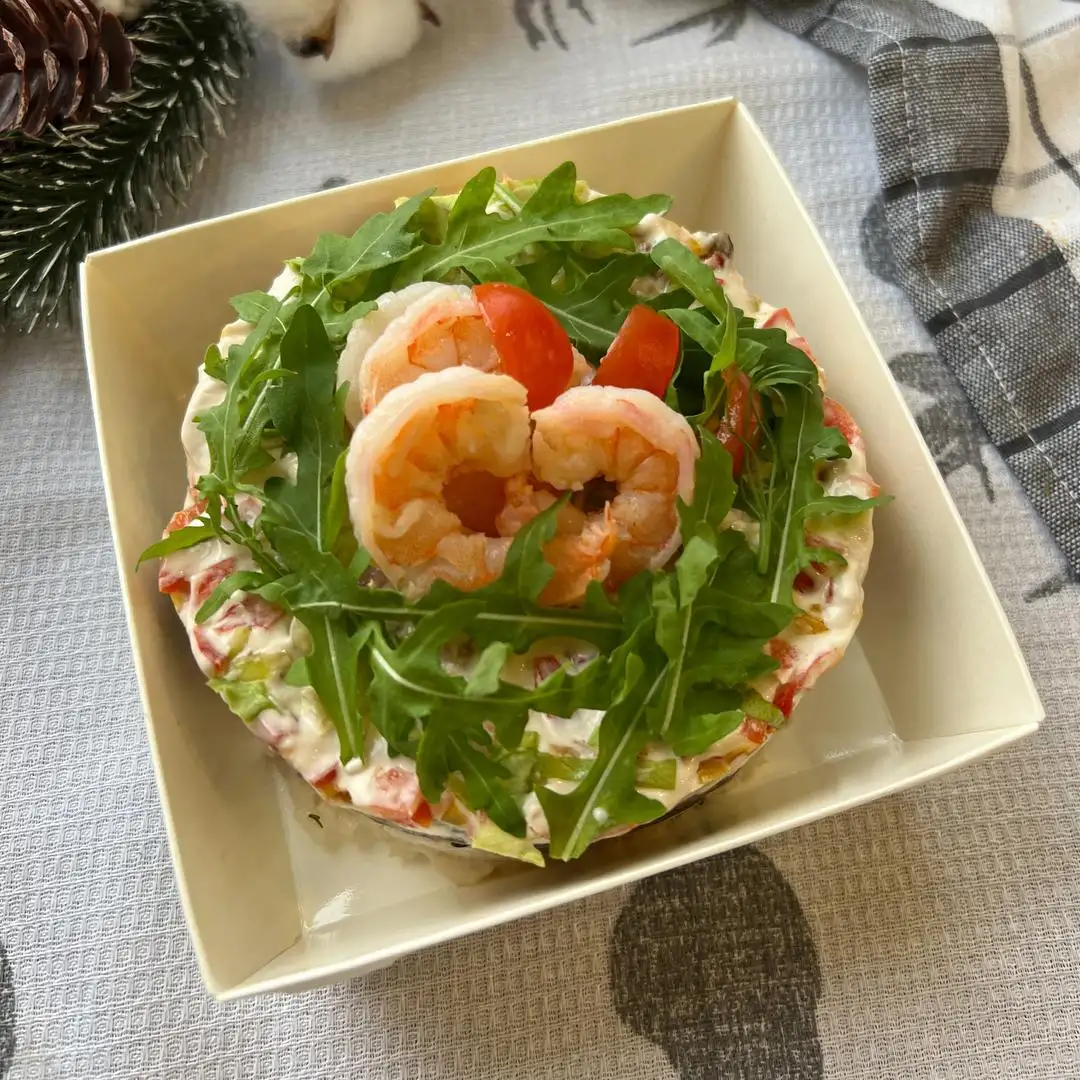 1 кг. — 64 руб. Состав: креветки, рис, перец, лук, шампиньоны, устричный соус, майонез, руккола.