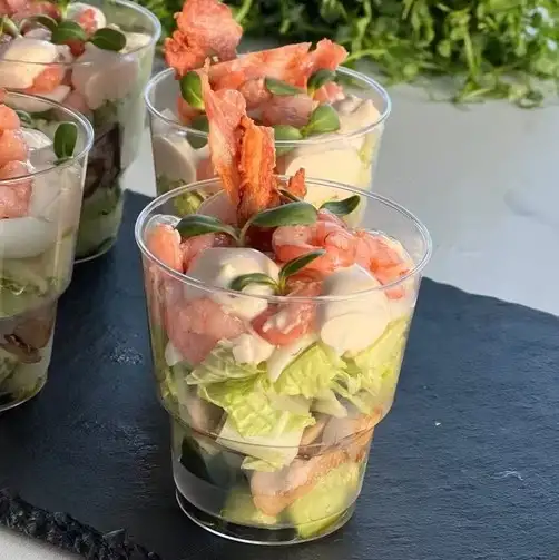 Креветка салатная, огурец свежий, яйцо перепелиное, бекон, капуста пекинская, шампиньоны, чеснок, заправка для салата. Заказ от 4 стаканчиков вес 1 шт. — 150 гр или 1 кг. — 65 руб.