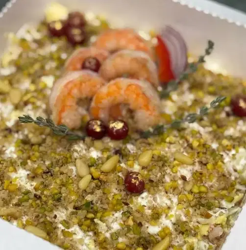 Креветки, куриное филе, ананас, сыр, чеснок (по желанию), майонез.