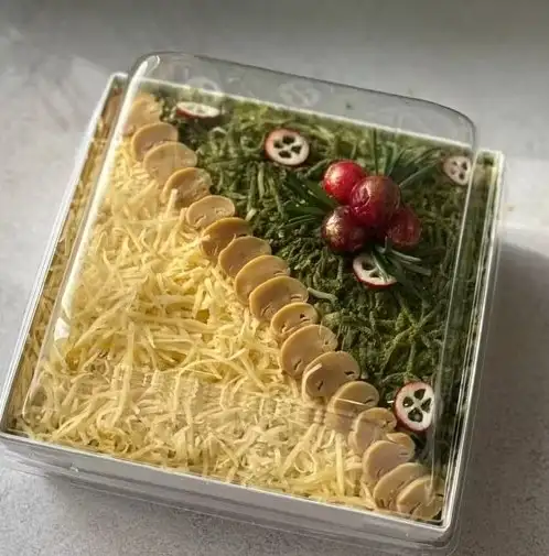 Состав: филе куриное, морковь, лук репчатый, шампиньоны, огурец маринованный, яйцо, сыр сливочный, майонез.