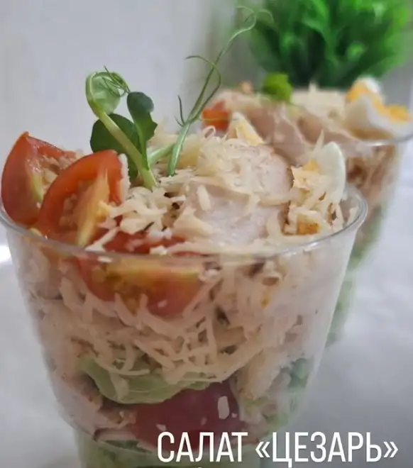 Состав: листья салата, томаты, куриное филе, перепилиные яйца, сыр, сухарики и соус. 1 стаканчик — 120 г Мин. заказ — 10 стаканчиков