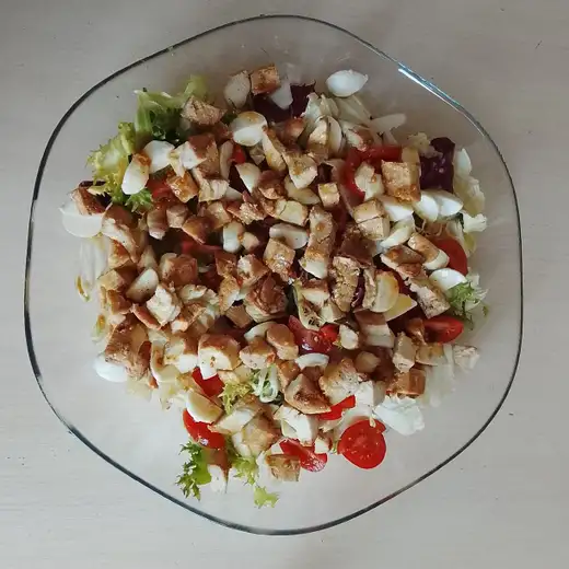 Салат «Весенний» состоит из сл. ингредиентов: микс салатов, моцарелла, черри и курочка, заправленный медово — горчичной заправкой. (доставляется в алюминиевой формочке) Внимание! при наличии аллергии на мед, салат употреблять нельзя.