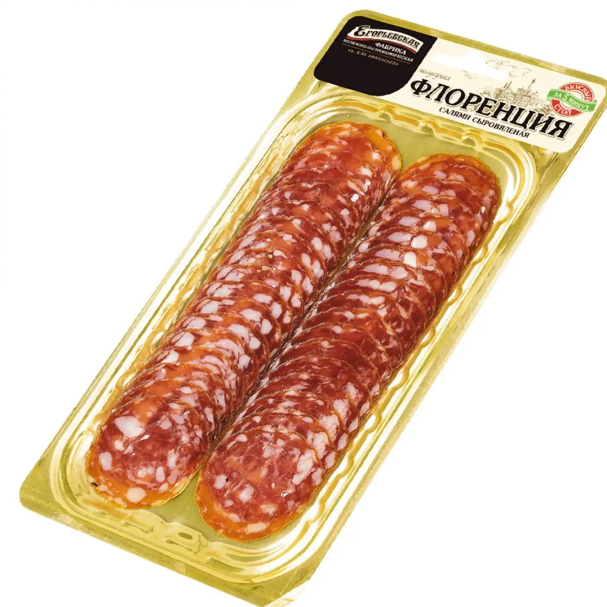 Основной состав: свинина, нитритно посолочная смесь, мальтодекстрин, декстроза, специи, бульон гранулированный, экстракт дрожжей, красители кармины, экстракт паприки, каротины.