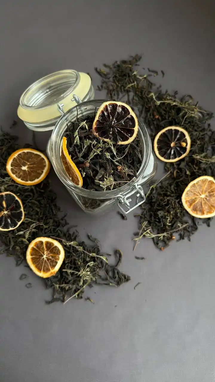 Состав чайного сбора «Пряный»: — иван-чай ферментированный — чабрец — дольки апельсина — дольки лимона — пряность гвоздики При первом глотке пряного чая вы ощущаете богатство и сложность его вкуса. Травяные ноты создают свежесть, в то время как пряности добавляют глубину и тепло. Он прекрасно согревает в холодное время года, создавая атмосферу уюта и спокойствия.