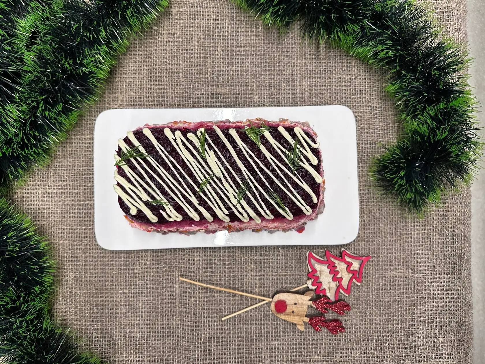 Описание: еще одна новогодняя классика. Закуска изготавливается в фольгированной форме, вам нужно просто перевернуть ее на тарелку и форму удалить. Не забудьте купить майонез. Заказать можно весом в 1 кг или 600г. Состав: сельдь, картофель, морковь отварные., свекла запеченная, майонез.