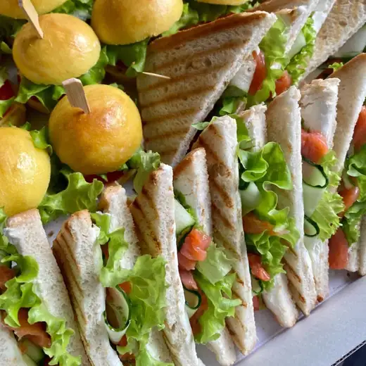 Состав: тост хлеб, слабосоленая сёмга, творожный сыр, салат, огурец, соус