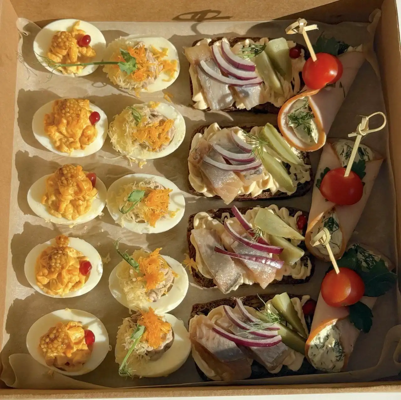 Состав фудбокса «Пасха» 800 гр. Яйцо фаршированное грибами — 6 шт. Яйцо фаршированное тунцом — 6 шт. Брускетта с сельдью и огурчиком — 4 шт. Рулетики из ветчины с творожной начинкой — 3 шт. Состав фудбокса «Мясной mini» 1000 гр Крылышки в пряном соусе — 200 гр. Ребрышки запеченные — 200 гр. Шашлычки из куриного филе — 200 гр. Куриные колбаски — 200 гр. Палочки овощные ассорти (овощное ассорти сельдерей/морковь/ перец); Фирменный соус Закуски упакованы в крафтовую перерабатываемую коробку, размером 27×27×8 см. Внутри коробка выстлана пищевым пергаментом.