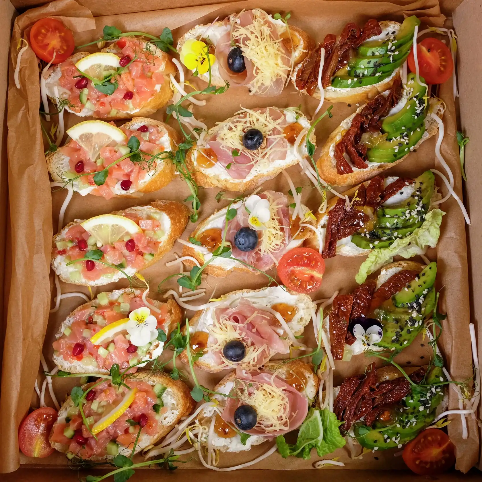 Состав фудбокса «Сырно-овощной» 1000 гр. Канапе c томатом и моцареллой — 4 шт. Канапе груша с сыром фета — 4 шт. Канапе сыр и виноград — 4 шт. Брускетта с авокадо — 2 шт. Рулетики из цукини с творожно-сырной начинкой — 4 шт. Рулетики из баклажана с творожно-сырной начинкой — 4 шт. Палочки овощные (овощное ассорти сельдерей/морковь/ перец); Фирменный соус Сезонный фрукт Состав фудбокса «Тарталетки mini» 800 гр. Тарталетки с креветкой — 8 шт. Тарталетки с салатиком из кальмара —8 шт. Тарталетки с пряной курочкой —8 шт. Состав фудбокса «Брускетта Mini» 700 гр. Брускетта с тартаром из лосося — 5 шт. Брускетта с авокадо и вяленым томатом — 5 шт. Брускетта с прошутто и апельсиновым джемом — 5 шт.