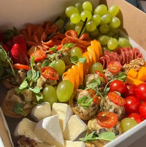 Фрукты (сезонные), сыр Чеддер, сыр Камамбер , томаты Черри, орехи, канапе салями и сыр, мясная нарезка, тарталетки запеченые с курицей и грибами