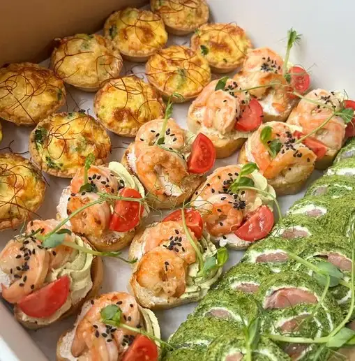 Мини-Киш с форелью 10 шт Кростини с креветками 10 шт Шпинатный рулет