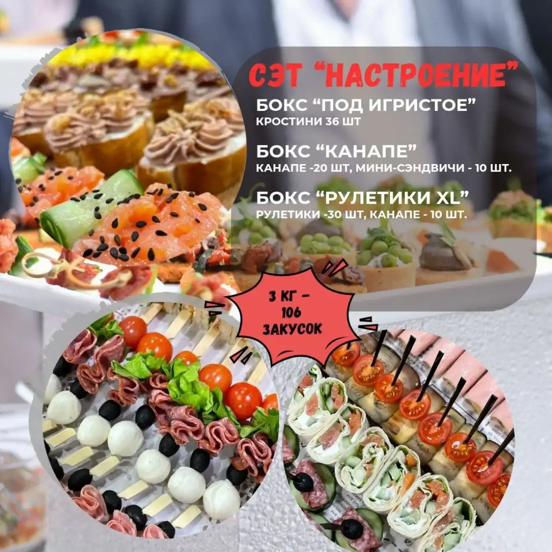 -Рулетики из баклажанов с начинкой из твердого сыра, чеснока и грецкого ореха, с черри. 10 шт -Рулетики из ветчины с начинкой из твердого сыра и грецкого ореха и чеснока. 10 шт. -Рулет из лаваша с начинкой из слабосоленой форели, свежего огурца, листьев салата и творожного сыра. 10 шт. -Канапе из свежего огурчика, сырокопченой колбасы и маслины. 10 шт. -Мини-сэндвич с ветчиной, томатом, твердым сыром, салатом, соусом 10 шт -Канапе из томата черри, салями, салата, сыра моцарелла, маслины 10 шт -Канапе из копченого сырного шарика, маслины, с/к колбасы 10 шт — Кростини с пассированными шампиньонами и творожным сыром 6 шт — Кростини с муссом из авокадо, королевской креветкой и томатом черри 6 шт — Кростини с сырно-яичным паштетом 6 шт — Кростини с паштетом (французский с яблоком) и жареным луком 6 шт — Кростини с бужениной (говядина), вяленными томатами, французской горчицей 6 шт — Кростини с слабосоленой форелью, творожным сыром и огурчиком 6 шт
