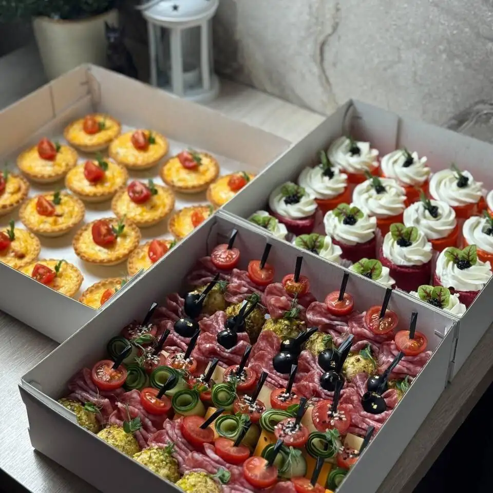 Бокс «Канапе» — чизболлы — 12 штук; — канапе с маслиной, сальчичон и сыром — 10 штук; — канапе с черри, огурцом и сыром чеддер — 10 штук. Бокс «Пирожные закусочные» — пирожные свекольные с муссом из снежного краба — 8 штук; — пирожные морковные с муссом из авокадо и кальмара — 8 штук. Бокс «Мини-киш» — мини-киш с карпачо — 16 штук.
