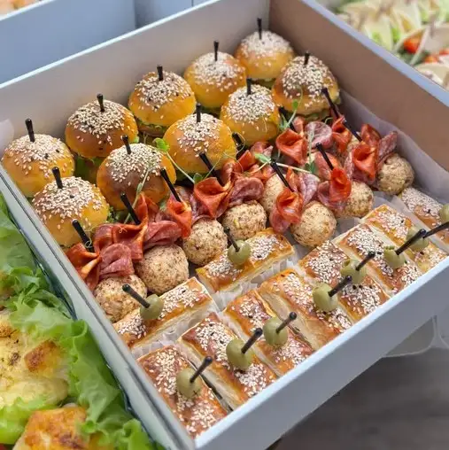 — мини-бургер — сырный шарик с салями — клаб-канапе с грудинкой
