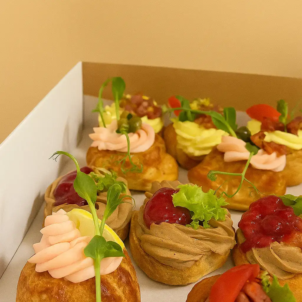 Кростини с яичным муссом и беконом — 5 шт Кростини с печеночным муссом и клюквенным конфи — 5 шт Профитроли с крабовым муссом — 5 шт Профитроли с муссом из форели — 5 шт