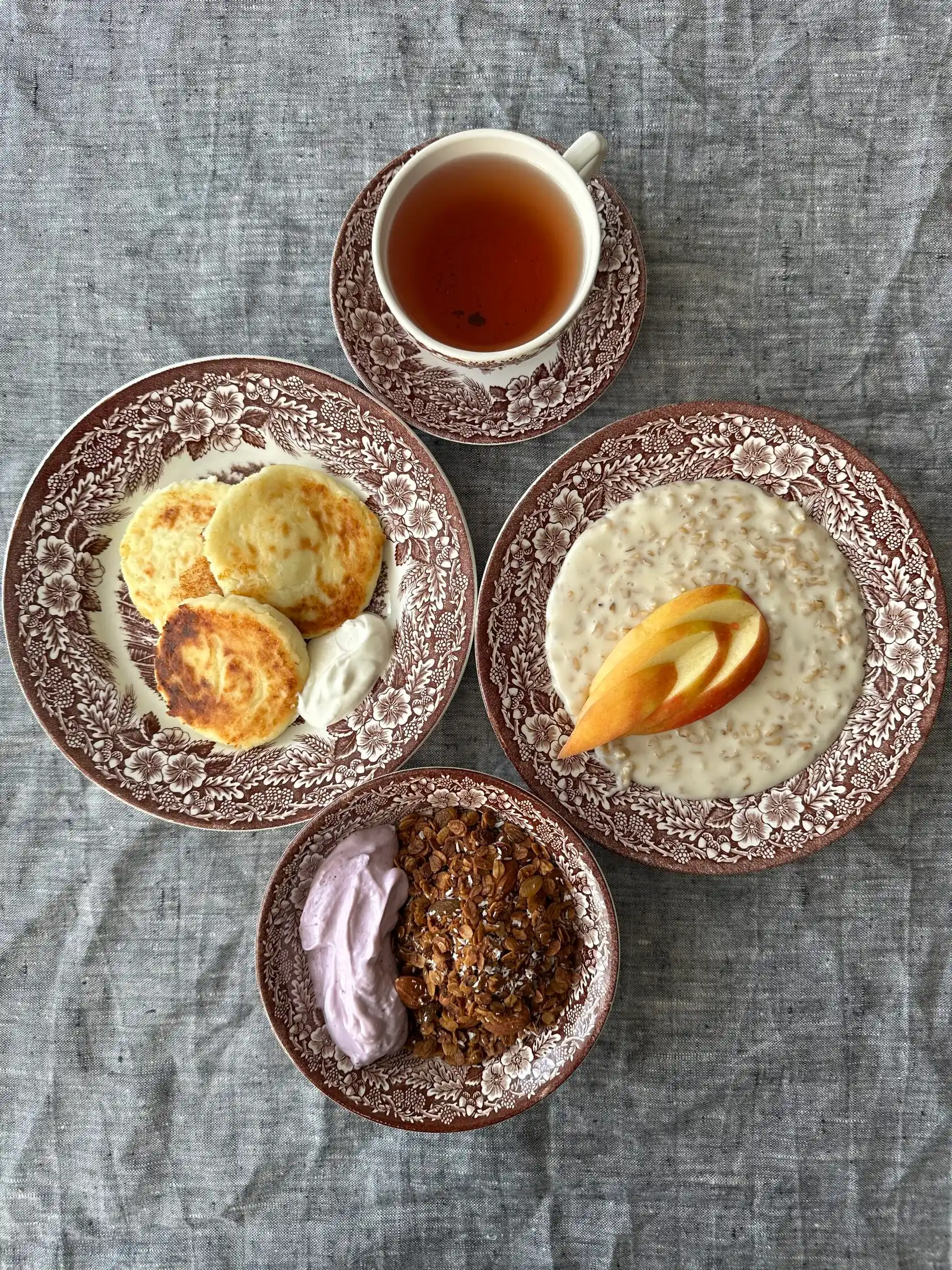 Состав: Сырники классические 500 г; Гранола 300 г; Блинчики с яблоком 500 г; Рисовая каша на кокосовом молоке с чиа и изюмом (продукт полностью готов) 300 г; Овсяная каша (зерно) с печеным яблоком 300 г. Способ приготовления: Сырники — на хорошо разогретую сковороду налить растительное масло (или кокосовое, или гхи), обжарить сырники до золотистого цвета с каждой стороны по полторы минуты. Затем уменьшить нагрев до половины, накрыть крышкой и жарить еще 5-6 минут, перевернув 1 раз; Гранола — залить гранолу тёплым молоком или добавить йогурт по вкусу; Блинчики с яблоком — продукт полностью готов к употреблению. Разогреть удобным для вас способом; Рисовая каша — продукт полностью готов к употреблению; При подогревании добавить 50 мл воды или кокосового молока; Овсяная каша с яблоком — продукт полностью готов к употреблению; При подогревании добавить 50 мл молока.