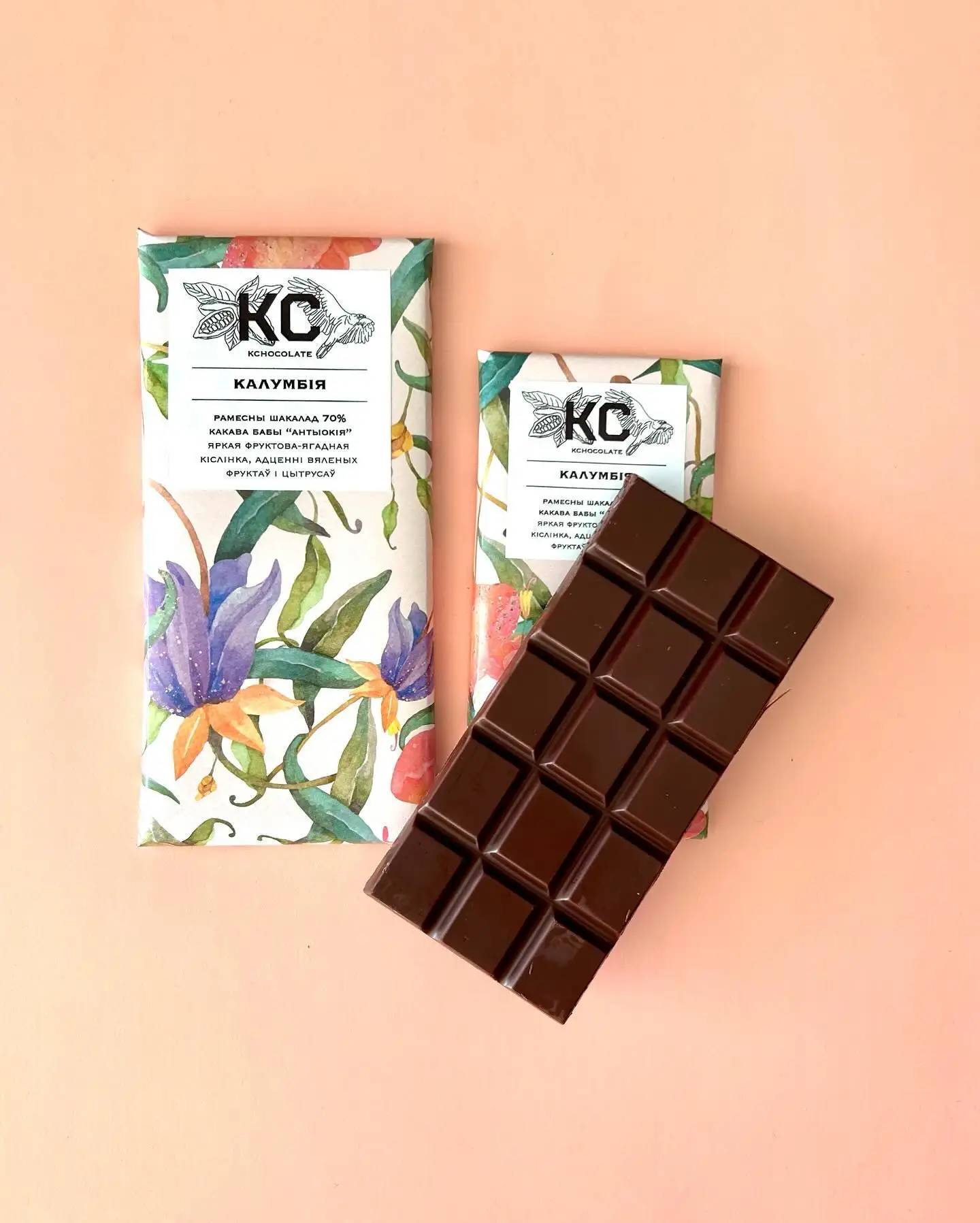 «Калумбія». Bean to bar. Шакалад 70%, зроблены ўручную з унікальных фермерскіх какававых зярнят «Эспіна дэ Алікантэ». Какава-бабы з рэгіёну Антыёкіа ў Калумбіі вырошчваюць у асяроддзі цытрусавых дрэў, кавы і ванілі, дзякуючы чаму яны ўбіраюць у сябе прыемныя водары гэтых раслін. Для какава-бабоў з Антыёкіі характэрны ярка выражаны водар какавы, які дапаўняецца водарамі цытрусаў і прыемнае духмянае рэха смаку.
