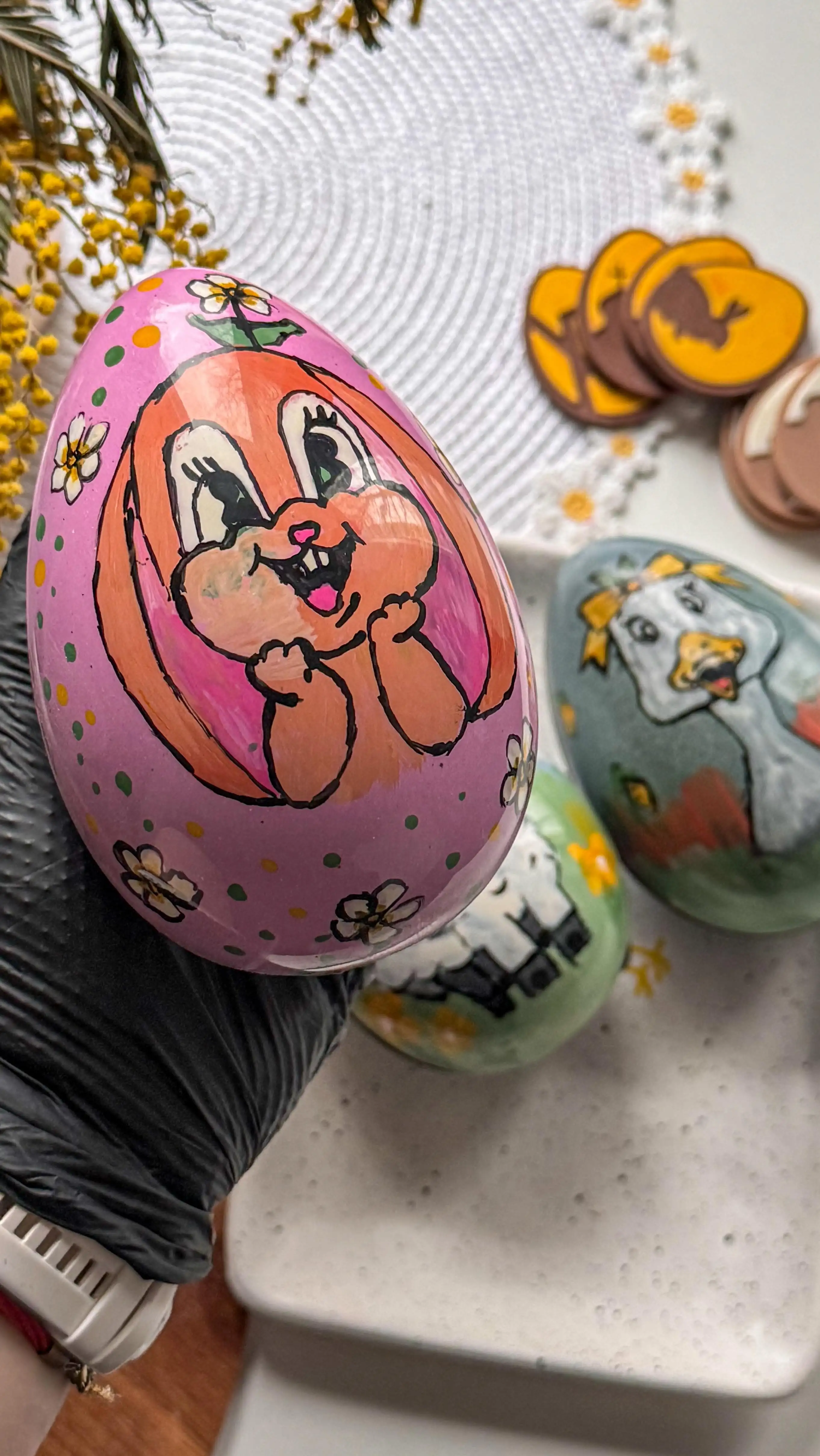 Расписные яйца, а внутри 4 поэтапно отлитых яйца 2Д. Упаковка: подарочный тубус.