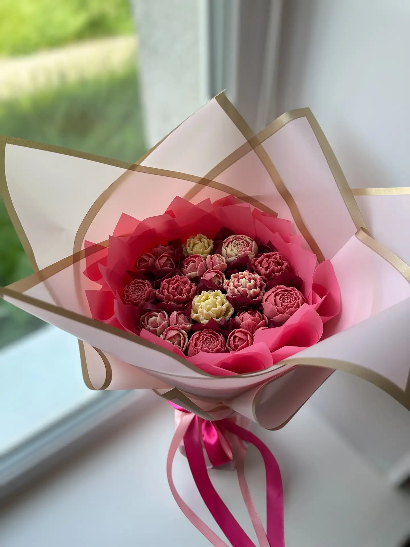 Начинки на выбор: — Соленая карамель — Карамельно-арахисовая — Шоколад-фундук — Кокосовый ганаш Букеты могут быть выполнены из белого, молочного и темного шоколада !