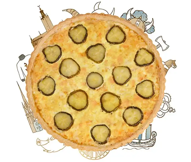 С картофелем и копченой грудинкой Потрясающее сочетание воздушного картофеля и сочного бекона, пикантные маринованные огурчики и аппетитная сырная корочка. Состав: начинка (картофель, карбонад свиной, грудинка свиная, огурцы маринованные, лук репчатый, чеснок), тесто (масло сливочное, мука пшеничная, яйцо куриное, сахар белый, соль, уксус, гидрокарбонад натрия Е500ii (сода пищевая)), соус (сливки животные, яйцо куриное, сыр). Срок годности: 48 ч. при температуре 4±2°C. Пищевая ценность продукта на 100 г: Калорийность — 210 ккал Белки — 6,5 г Жиры — 12,0 г Углеводы — 19,0 г Рекомендуем резать на кусочки: по весу 500 г на 4 кусочка по весу 850 г на 8 кусочка Уточнения: Вес 500 г — Ø пирога ≈ 18 сантиметров Вес 850 г — Ø пирога ≈ 24 сантиметров Внешний вид изделий может отличаться от фотографий, так как каждый пирог — это ручная работа