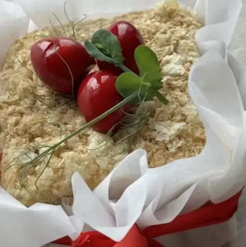 Тесто слоеное, яйцо куриное,лук репчатый, морковь,шампиньоны, майонез,яйцо перепелиное, микрозелень