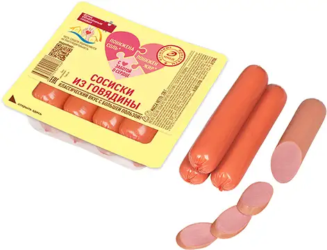 Состав: говядина, вода питьевая, мясо кур, жир говяжий, крахмал картофельный, яичные продукты, нитритно-посолочная смесь (соль, фиксатор окраски (нитрит натрия)), молоко сухое обезжиренное, белок животный говяжий, стабилизатор (альгинат натрия), регулятор кислотности (трифосфаты), усилитель вкуса и аромата (глутамат натрия), антиокислитель (аскорбиновая кислота), специи (перец душистый, кардамон), экстракты специй (перец черный, розмарин), краситель (кармины).