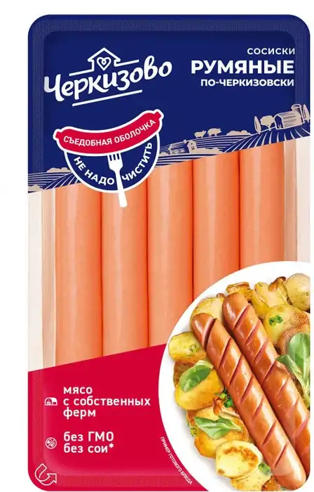 Сосиски «Румяные по-черкизовски» приготовлены поособенному. Они тоньше обычных сосисок и бережно набиты в белковую оболочку, которую не надо чистить. Такие сосиски невероятно сочные внутри и хрустящие снаружи!