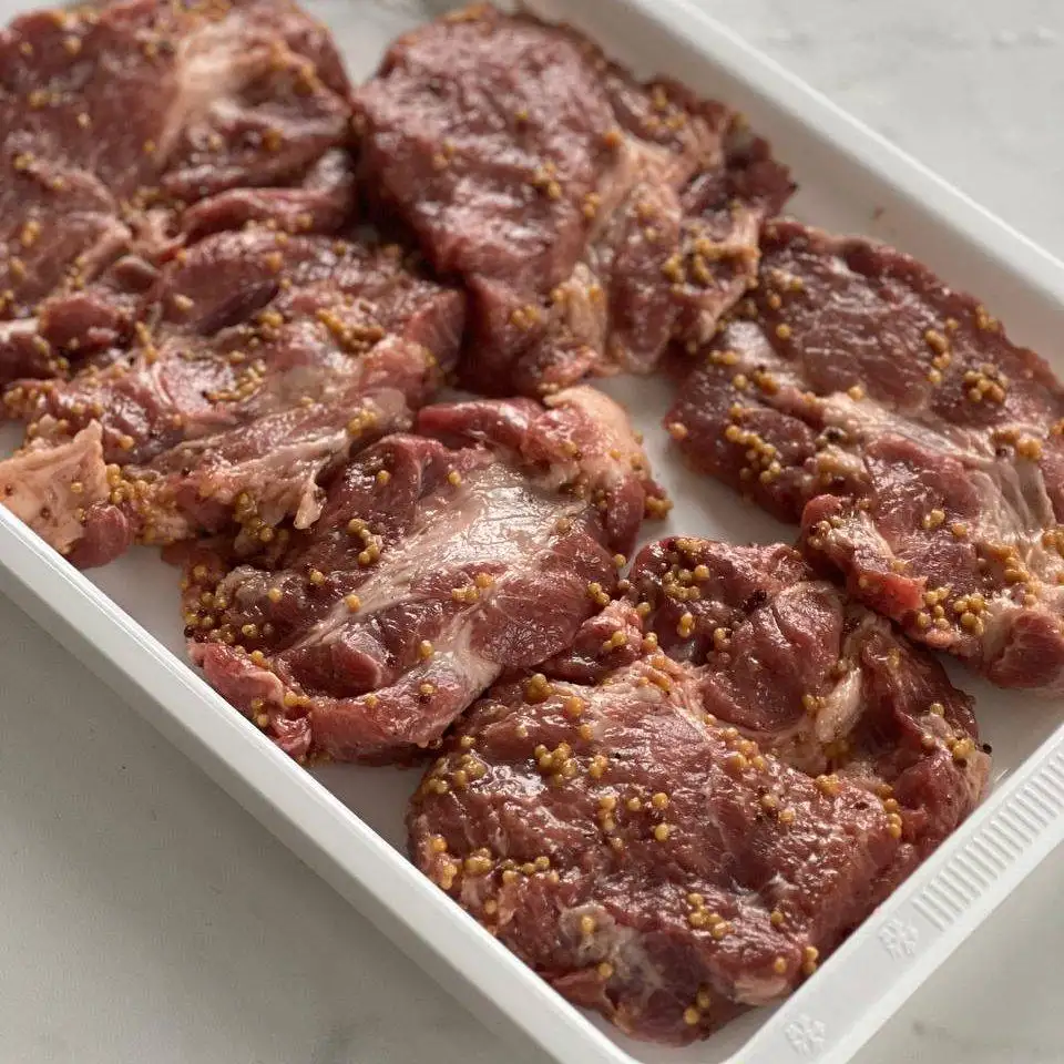 Стейк из свинины (свиная шея, горчица французская, приправа для шашлыка, перец, соль, масло подсолнечное).
