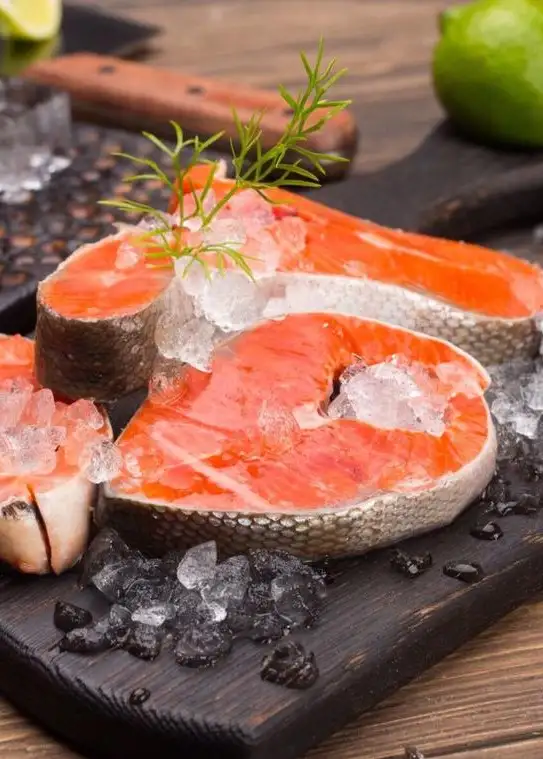 Свежемороженые стейки нерки. Мясо этой рыбы превосходит по жирности, вкусу и аромату других лососевых и считается одним из лучших рыбных деликатесов. Ярко-красный цвет мясо нерки приобретает благодаря каротиновым пигментам, содержащимся в организме ракообразных — калонидах, которыми питается рыба. Средний вес упаковки 0,5 кг