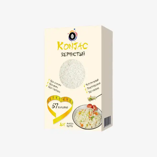 Конжак зернистый — 100% растительный продукт из конжаковой муки, богатый натуральными растворимыми волокнами. Не содержит сахаров и отличается высоким содержанием клетчатки. Особенности продукта: • Нейтральный вкус, легко адаптирующийся к любым соусам и приправам • Ускоряет обмен веществ • Уменьшает чувство голода • Способствует очищению организма от токсинов и шлаков • Помогает снижению избыточной массы тела • Обеспечивает чувство насыщения даже от небольшой порции Подходит для людей с избыточной массой тела, диабетиков, приверженцев безглютеновой и низкоуглеводной диеты, а также для всех, кто ведет здоровый образ жизни. Конжак — натуральная растительная клетчатка, полезная для похудения и общего здоровья. Однако, как и в случае со всеми продуктами, богатыми клетчаткой, его следует есть в умеренных количествах. Существуют некоторые противопоказания к его употреблению: 1. Гастрит. В период обострения может раздражать стенки слизистой желудка. 2. Колит. При обострении, растительные волокна конжак могут усугубить состояние. Поэтому с осторожностью употребляем, если имеется такое заболевание. 3. При подозрении на индивидуальную пищевую непереносимость или индивидуальную аллергическую реакцию необходимо обратиться к врачу для диагностики и определения дальнейшей тактики. Перед пробой продукта рекомендуется ознакомиться с возможными ограничениями и учитывать особенности вашего организма. Способ приготовления: 1. Варите в течение 5-7 минут. 2. Слейте воду. 3. Добавьте ингредиенты по вкусу (зелень, овощи, курицу, говядину, морепродукты, соусы, специи). 4. Наслаждайтесь вашим блюдом! Подходит для подачи как в горячем, так и в холодном виде. Отлично дополняет гарниры и салаты. Состав: конжаковая мука, рисовая мука, вода. Пищевая ценность на 100 г продукта: белки — 1,5 г, жиры — 0,3 г, углеводы — 13,9г,пищевые волокна — 0,2 г, натрий — 2 мг. Энергетическая ценность (калорийность): 67 ккал / 280 кДж. Условия хранения: Храните в сухом, прохладном месте, защищенном от яркого света и тепла. Температура хранения 5-25 °C. Срок годности 24 месяца.