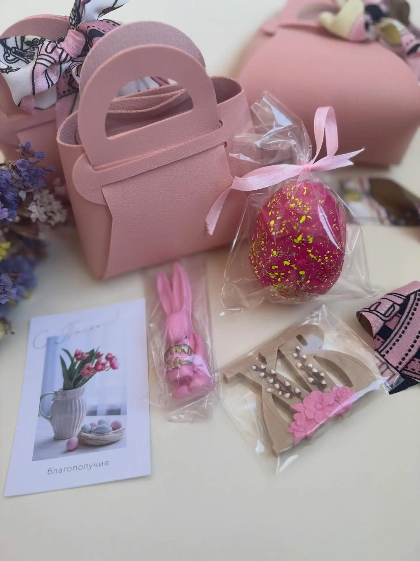 Наполнение: яйцо с сюрпризом (шоколадный цыпленок и мармеладное драже), зайчик, надпись, открытка