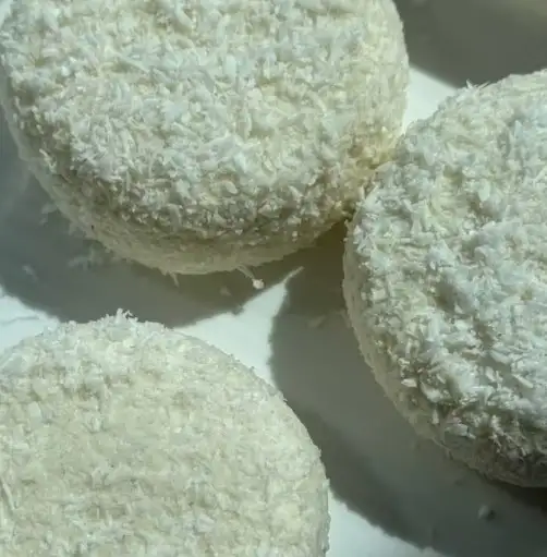 Творог, яйцо, сахар, мука рисовая, стружка кокосовая, ванилин, джем (в ассортименте) КБЖУ готового изделия на 1 шт 55г.: Белки 3,8 г. Жиры 6,8 г. Углеводы 13,5 г. Ккал 130
