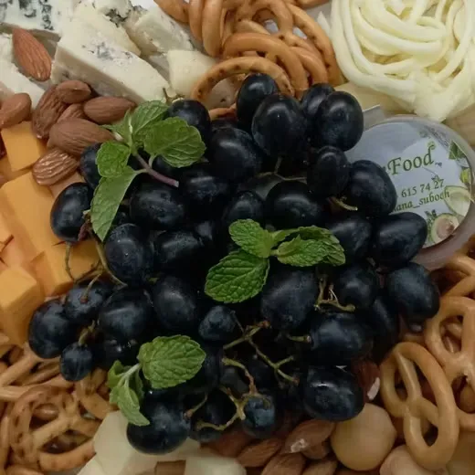 Бокс 800г Состоит из: - бри - Дор Блю - чедер -чечил - косичка сырная - виноград - орехи - мед