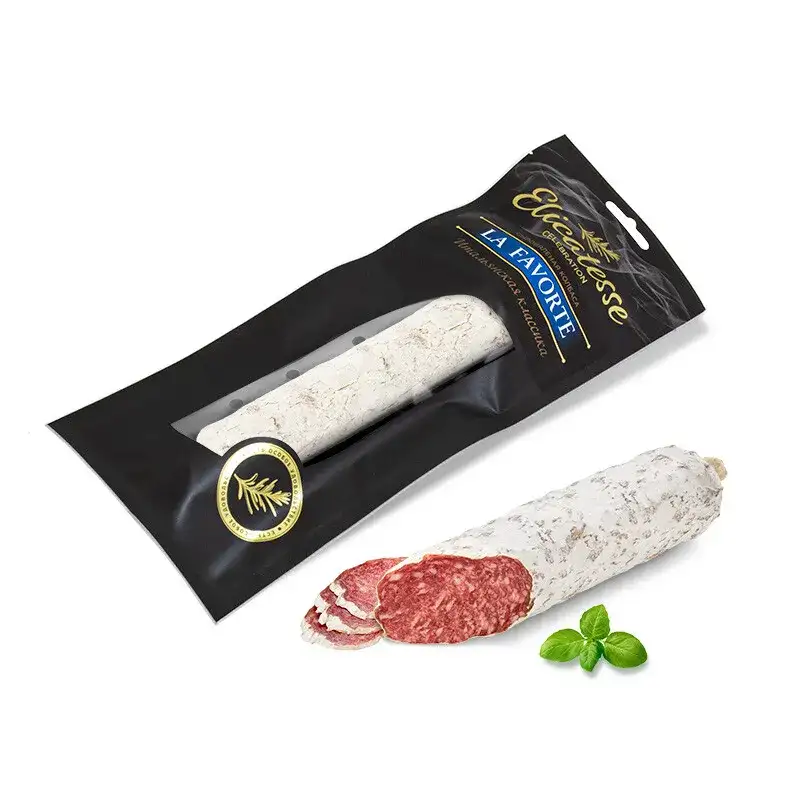 Эталон итальянской классики. «Вызревшая» под благородной белой плесенью, сыровяленая колбаса из свинины со спокойным вкусом, мелкозернистым изящным срезом.