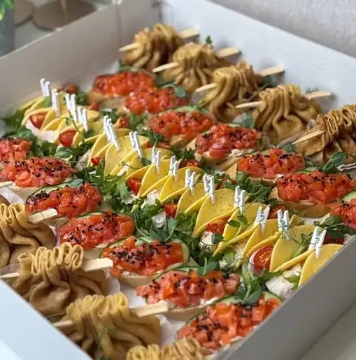 — блинчики жульен, 12 шт. — кростини с красной рыбкой — тако цезарь
