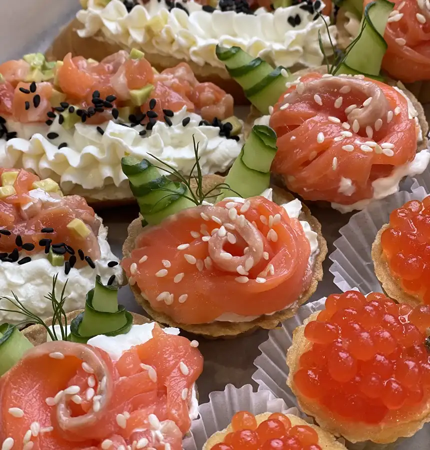Тарталетка средняя, творожный сыр, форель, свежий огурец