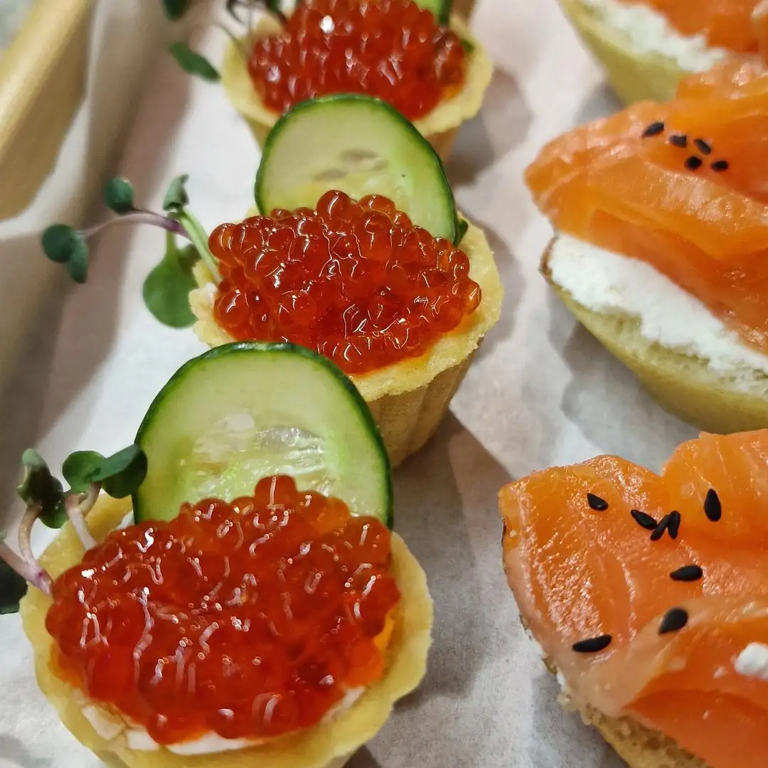 Состав: тарталетки, сыр творожный, икра, микрозелень, огурец.
